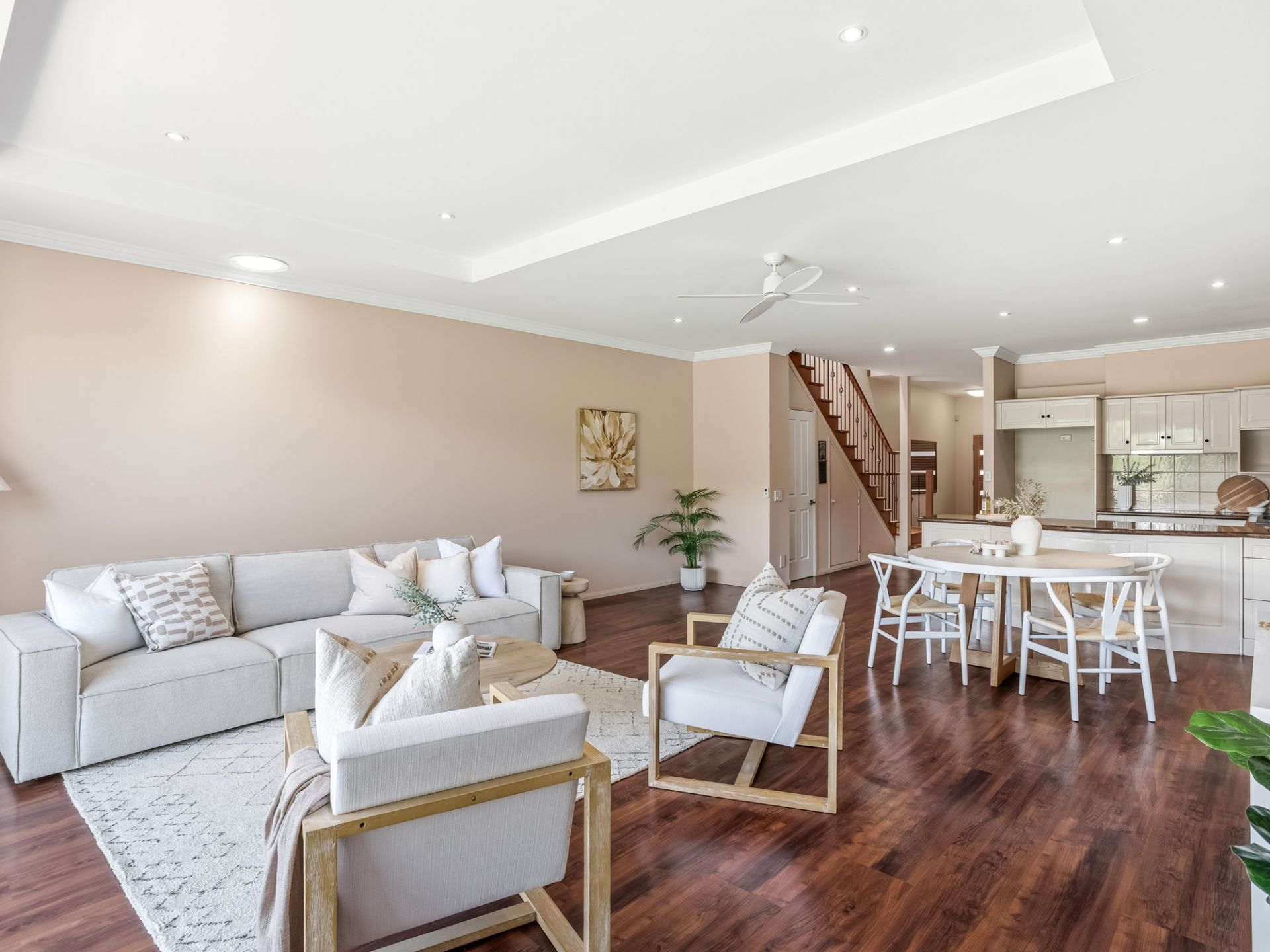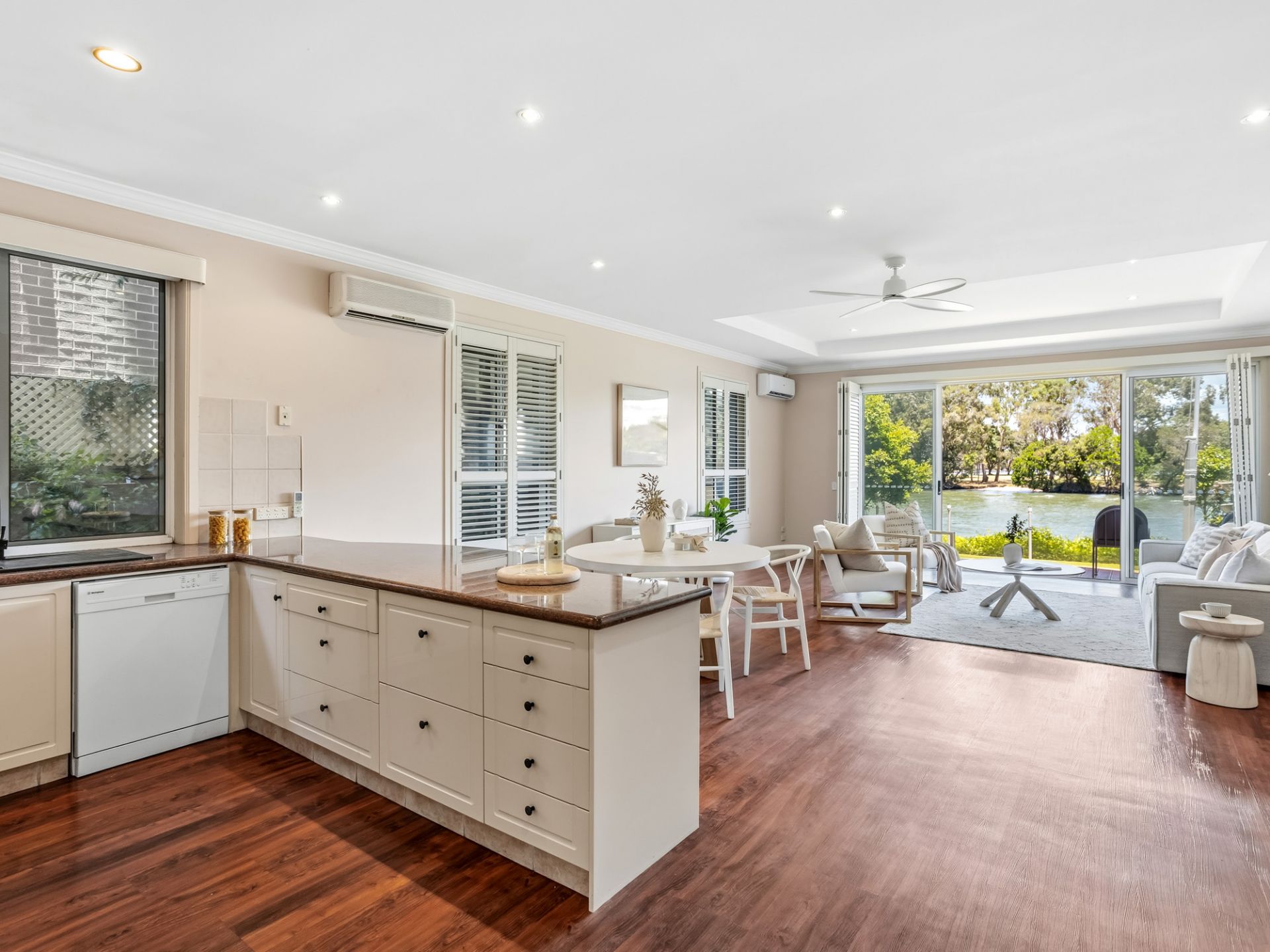 - Open plan living and dining areas filled with natural light