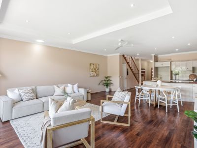 The kitchen sits centrally within the home, offering ample bench space, quality appliances and excellent storage, making it as practical as it is inviting. Its connection to both the living zones and outdoor entertaining area ensures effortless hosting, while a ground floor powder room and separate laundry add further convenience.
