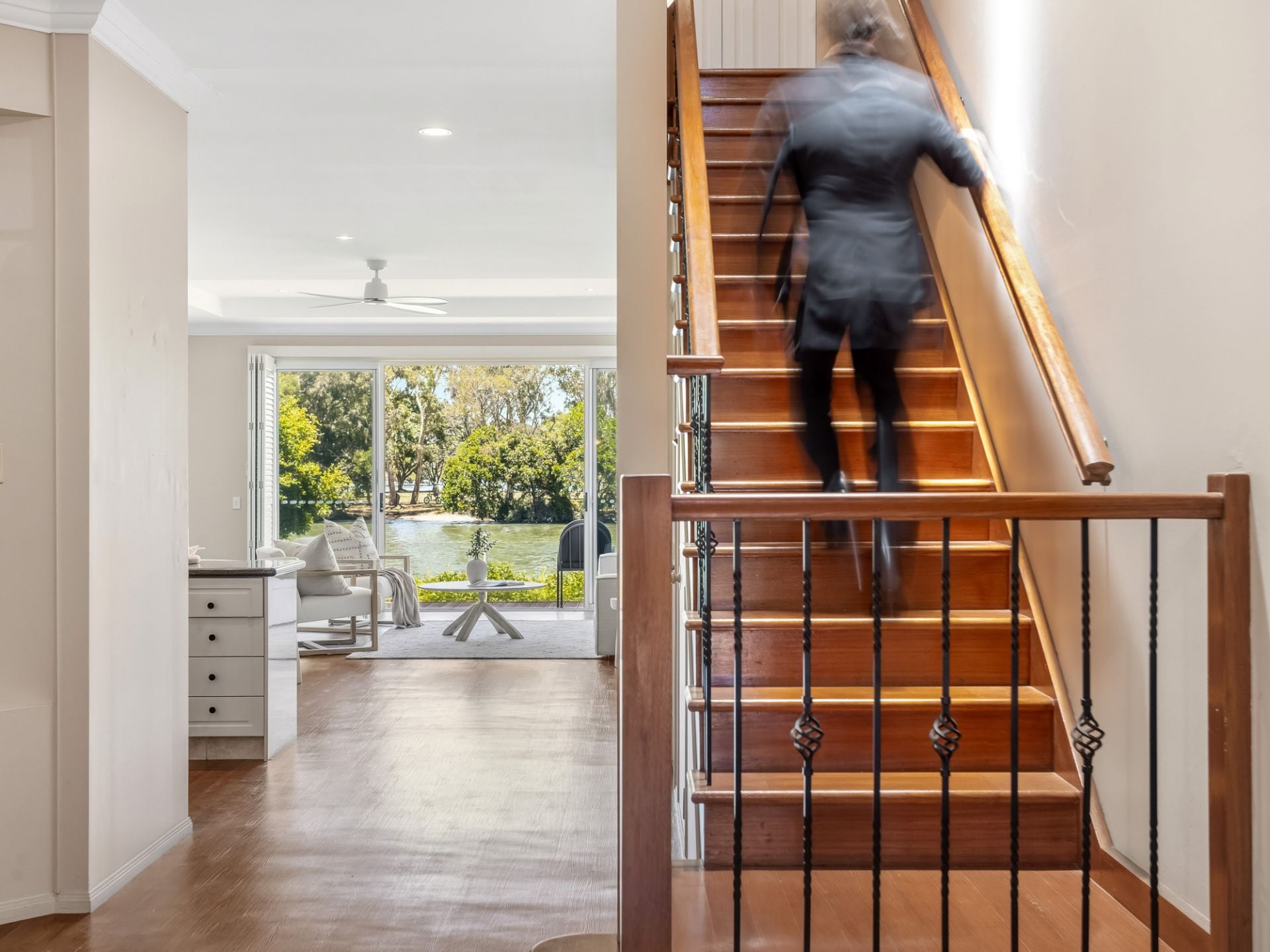 Spanning two generous levels, the ground floor has been thoughtfully designed to embrace its prized riverfront position. Open plan living and dining areas are filled with natural light and flow seamlessly through to the rear alfresco zone, where manicured lawns, established greenery and glass fencing frame expansive views across the Nerang River toward HOTA and the surrounding parklands. This outdoor space is both private and tranquil, offering a rare combination of river frontage and seclusion - ideal for entertaining, relaxing, or simply enjoying the outlook throughout the day.