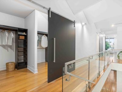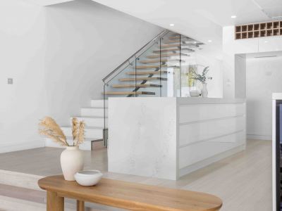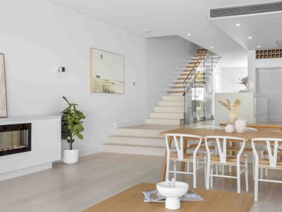 - Floating staircase design, high ceilings, and elegant timber flooring